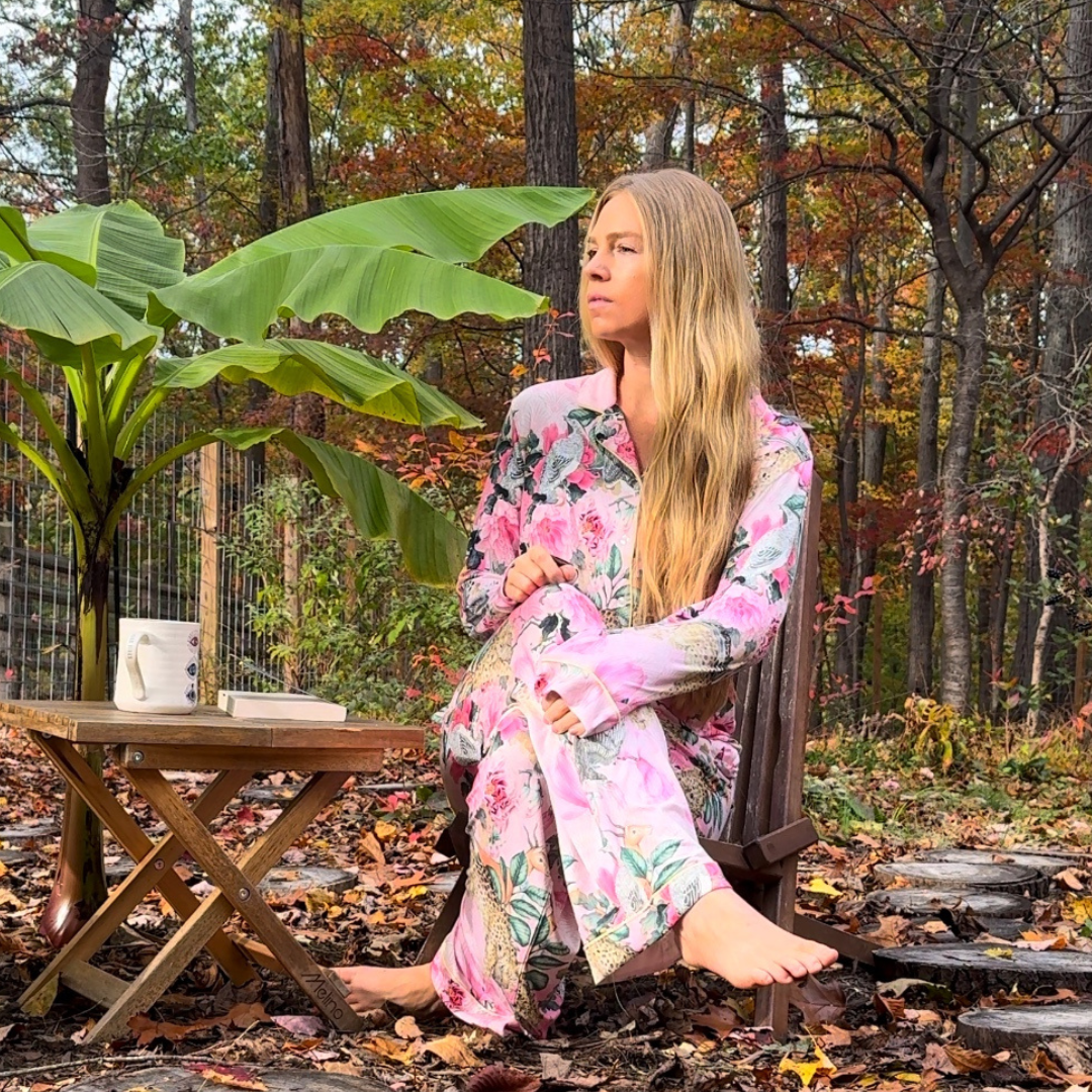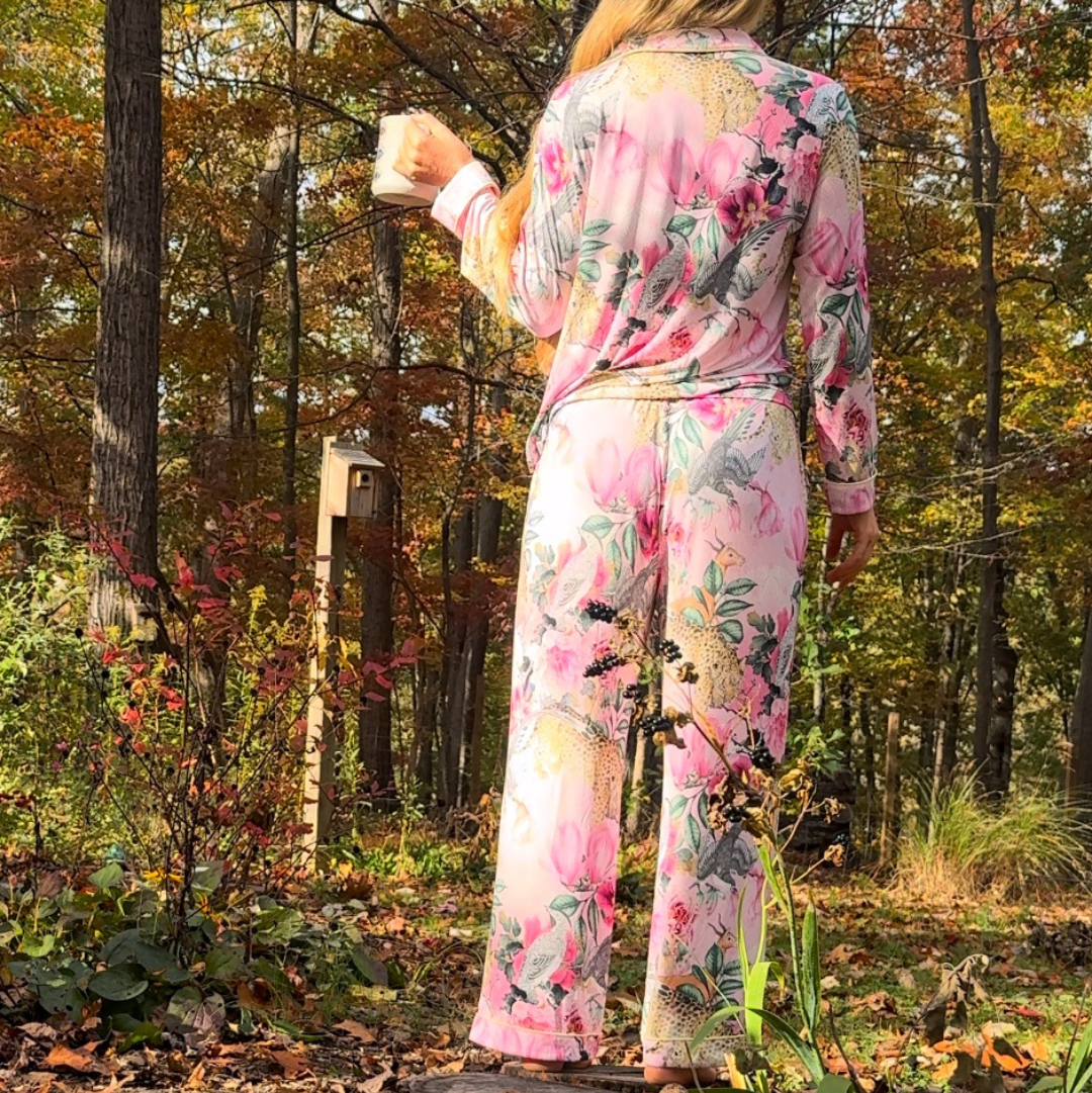 TheSavanna print is a painterly tribute to the untamed beauty of nature, featuring jaguars, lush foliage, and wild blooms from the world’s most vibrant landscapes. Set against a soft pink backdrop, it brings a feminine touch to the wild