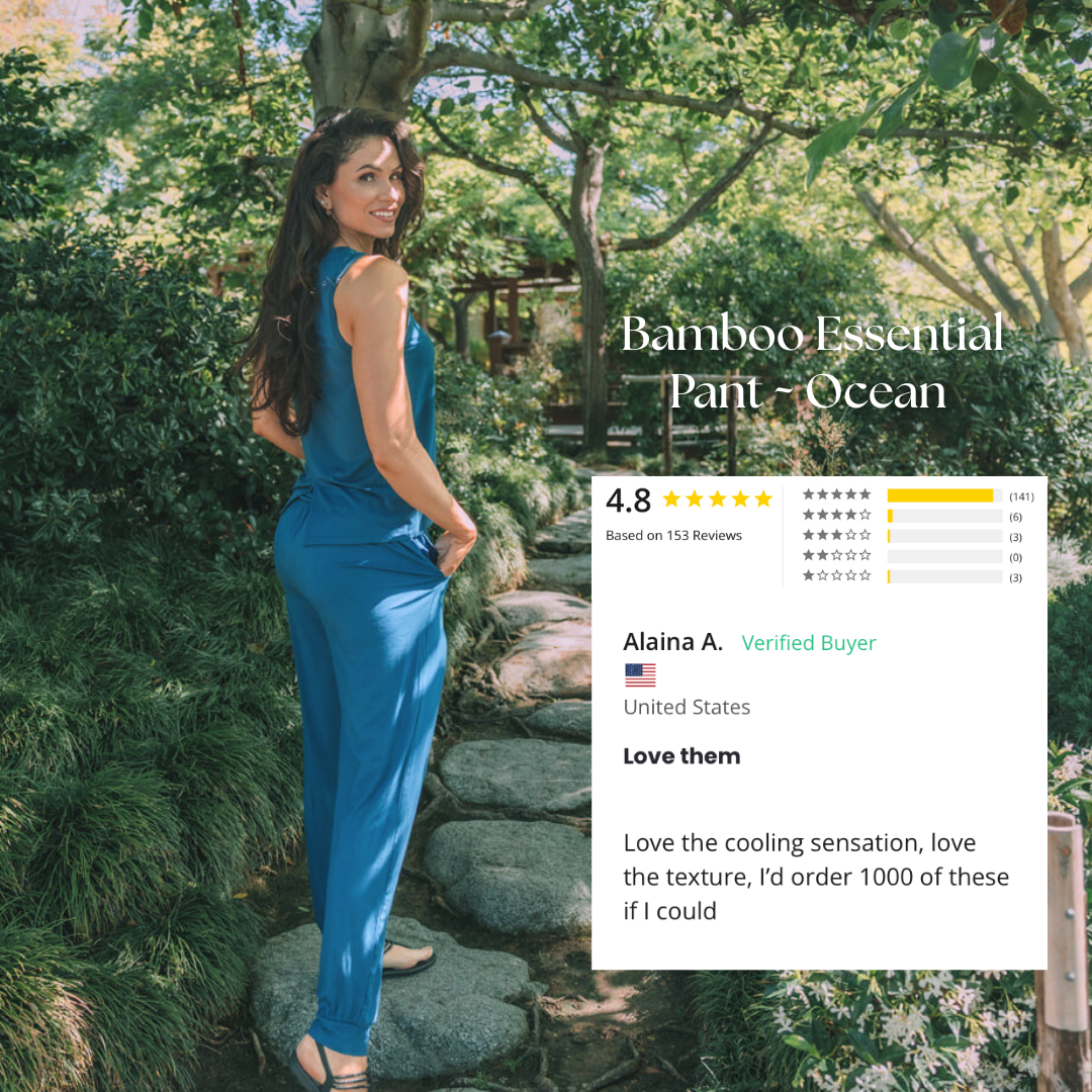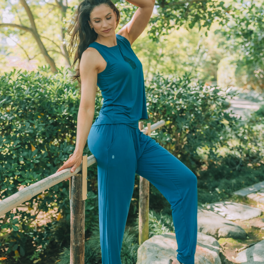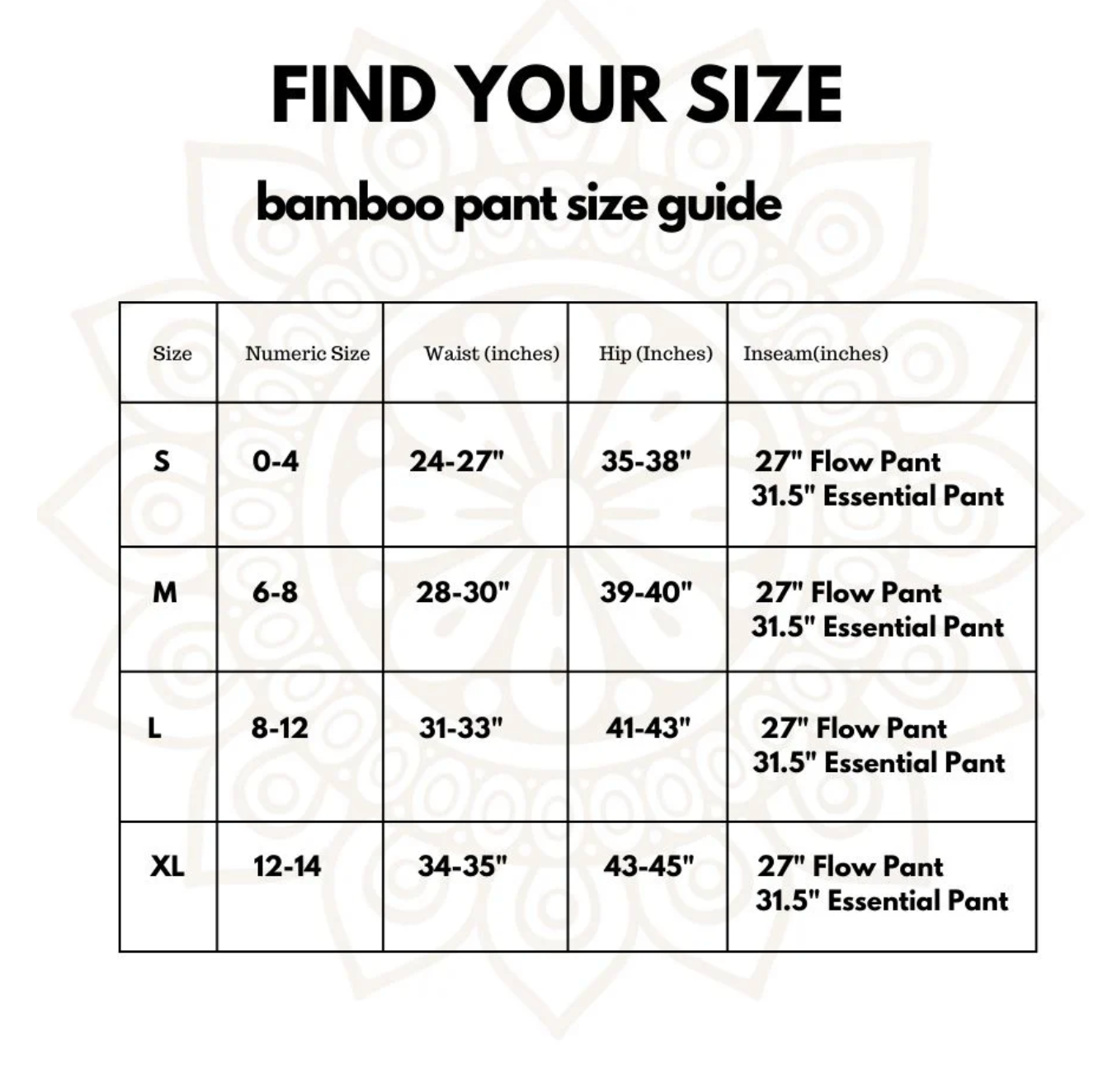 This fall, get two fan favorites in one bundle at a great price. The Flow Tank is made from soft ocean blue bamboo with a stylish darker blue print. It offers a loose, comfortable fit with a keyhole back and adjustable tie so you can wear it cropped or longer. The Essential Pant is incredibly soft and perfect for yoga, shaped to hug your body without sagging thanks to spandex. Both pieces regulate temperature, resist odors, and are easy to care for. With deep pockets, cuffed hems, and a foldable waist, they combine comfort and style effortlessly. Inseam is 31.5".